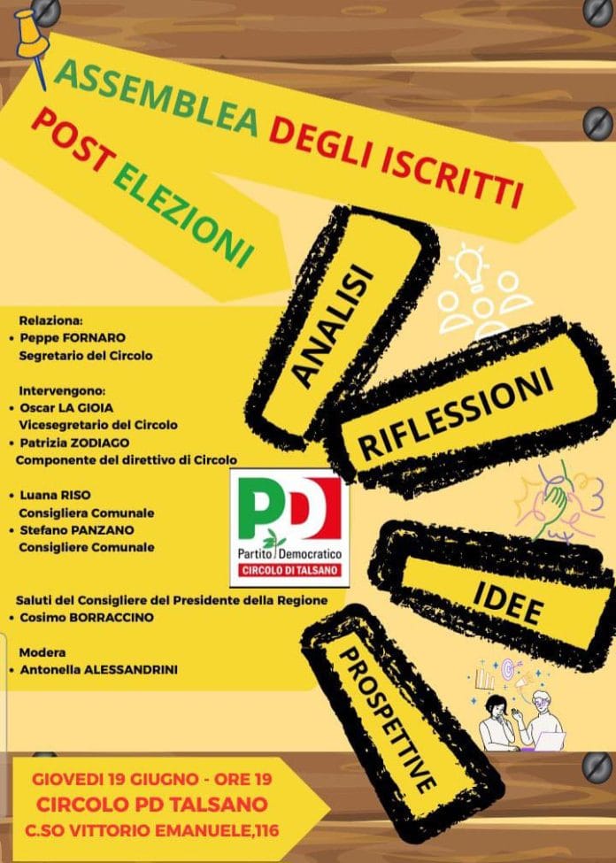 Sia gli organi di stampa che gli iscritti sono tutti invitati all’Assemblea che si svolgerà giovedì 19 giugno presso il Circolo PD di Talsano sito in C.so Vittorio Emanuele, 116.